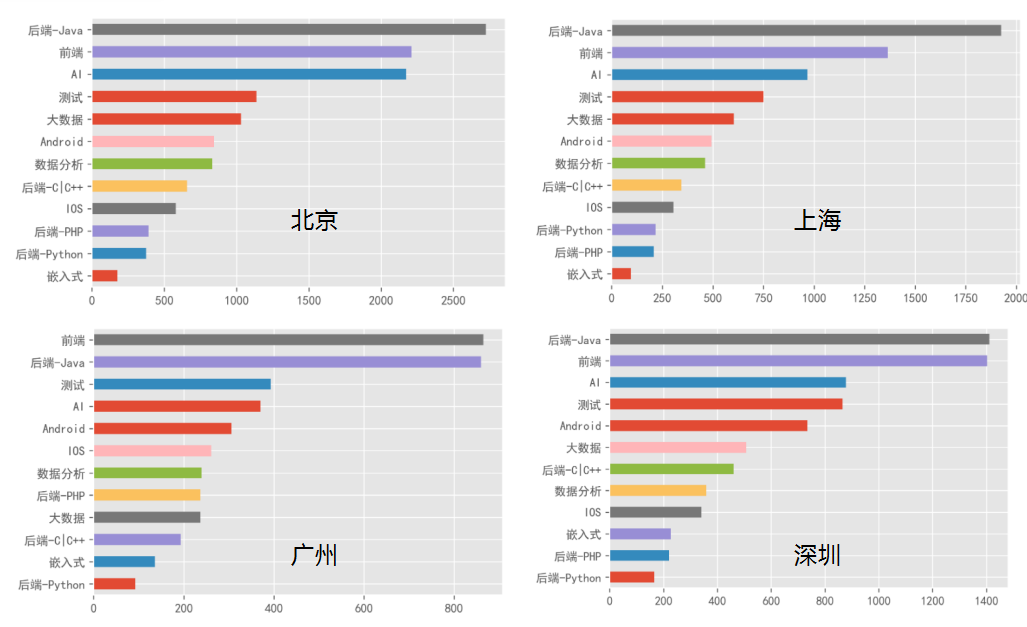北上广深4个城市目前招聘较多的岗位主要是后端-Java、前端、AI和测试。