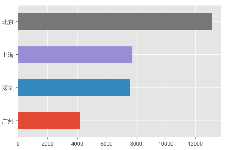 可以看到,目前北京招聘的岗位最多,其次是上海和深圳,广州是最少的。