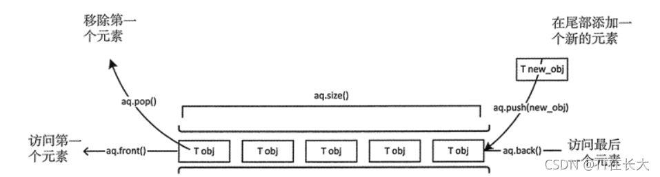 标准容器类deque和list满足了queue要求。默认情况下,如果没有为queue实例化指定容器类,则使用标准容器deque。