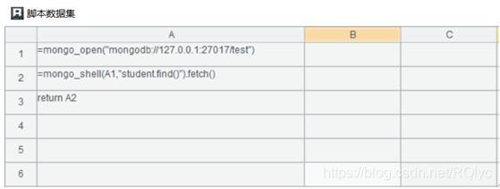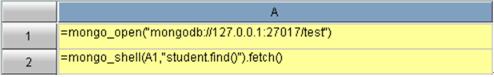 A2:=mongo_shell(A1,“student.find()”).fetch() 从 student 中取数,也可以实现 count、distinct 和 aggregate 操作