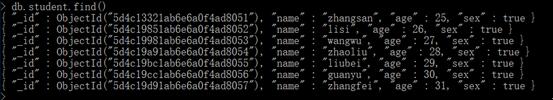 具体使用见文档中即可,比如现在 mongodb 中有张数据表(集合)student,里边数据为: