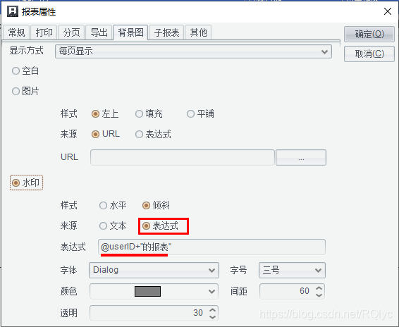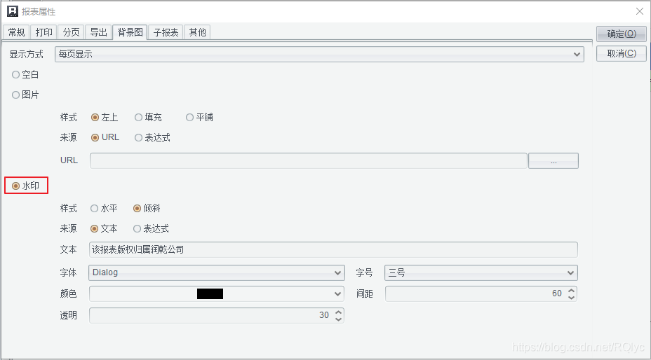 在“文本”输入框内输入要在报表内显示的水印内容,如“该报表版权归属润乾公司”