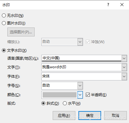 但同一个 word 只能设置一条水印内容,即只能是静态水印,不能动态生成,如上面文字水印的“文字”内为“我是 word 水印”,该 word 就只能提供这个固定的水印信息了,除非再次编辑 word 修改。
