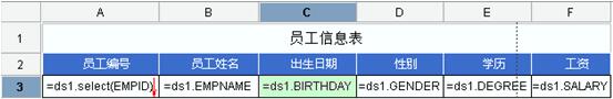 可以看到,ID 中的数据就是员工表中学历列的值,NAME 字段存储的是对应的中文,这样可以根据 ID 和 DEGREE 字段的关联,取出需要的中文进行显示,在 E3 单元格的显示值表达式中写入:ds2.select(NAME,ID==value(),1),该表达式含义为从 ds2 数据集中取出 ID 等于当前单元格值的 NAME 字段的值放到显示值中显示,注意后边的 1 为取出满足条件的第一条记录,如果有满足直接进行返回不再向后判断,所以为提高报表计算效率,需要增加“1”的设置。这里用到了从另外一个数据集中取出对应的中文的写法,实际使用中,如果字典表和数据表在同一个库中,建议通过一个 sql 通过 where 关联方式直接取出中文,这样当数据量大时效率更高,如果数据来自不同库,数据量大时导致计算较慢,可以通过集算器将两个数据集 join 在一起返回到报表是一个数据集,这样效率更高,具体看实际需求。