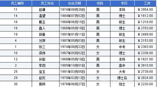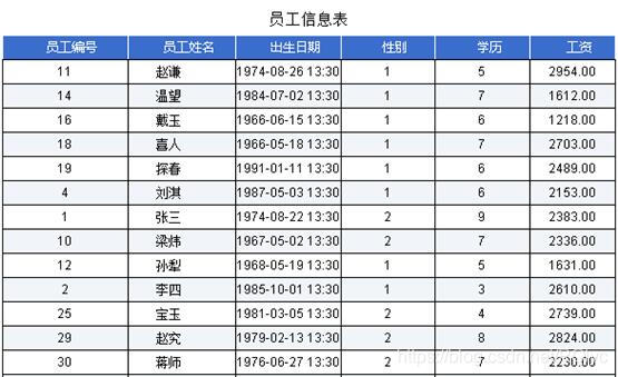 首先连接润乾自带的 demo 数据源,从“员工”表中取数制作一个员工信息表,报表模板如下图: