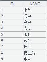 学历单元格设置和性别有些类似,都要通过显示值表达式进行设置,可以使用 if 或 map 函数,但是学历数据会较多,需要写入大量的表达式,并且学历在数据库中可能是会变化的,比如过段时间会增加个新学历,还要再次修改报表,针对此种形式,数据库中通常会有中文字典表。在报表中新增数据集,从“DEGREE”表中取数,该表中数据如下: