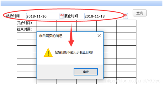当筛选面板中选择的起始时间早于截止时间时,点击查询便会弹出提示,提醒用户修改。如下图