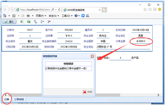出错提示为:订单明细中总金额和订单中金额不一致!
