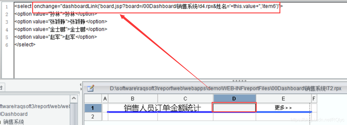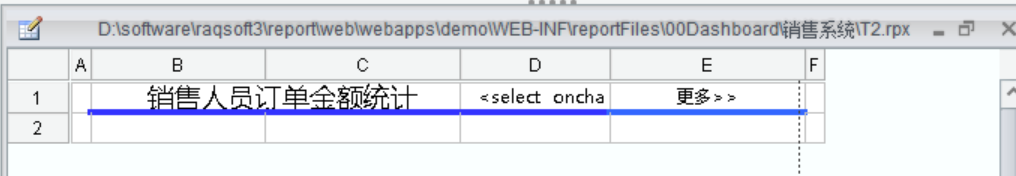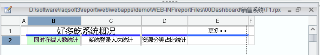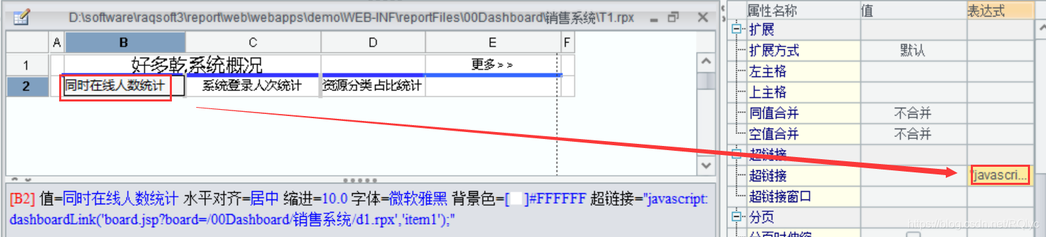 3. 对区块一中的页签报表添加切换操作,选中 B2,C2,D2 单元格,添加超链接表达式,“javascript:dashboardLink(‘board.jsp?board=/00Dashboard/ 销售系统 /d1.rpx’,‘item1’);”