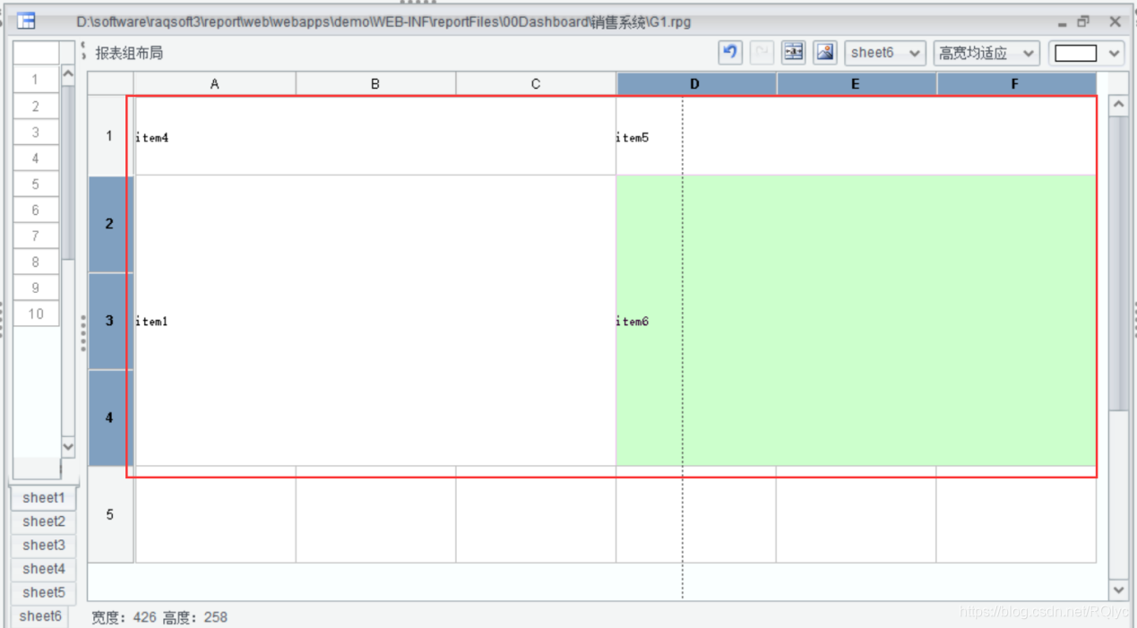 在报表组布局面板中设置报表显示的位置,并设置每一个报表在对应区块的适应方式。