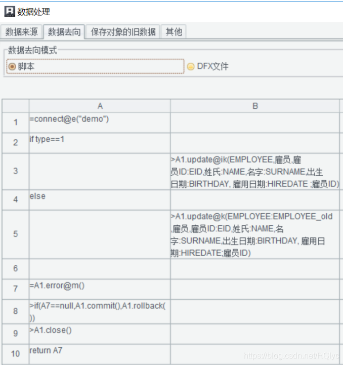 B5:>A1.update@k(EMPLOYEE:EMPLOYEE_old, 雇员, 雇员 ID:EID, 姓氏:NAME, 名字:SURNAME, 出生日期:BIRTHDAY, 雇用日期:HIREDATE; 雇员 ID) // 当不满足 if 条件时,将页面中 EMPLOYEE 对象修改了的数据更新到数据库中,当 update 后无其他选项时,表示执行智能更新