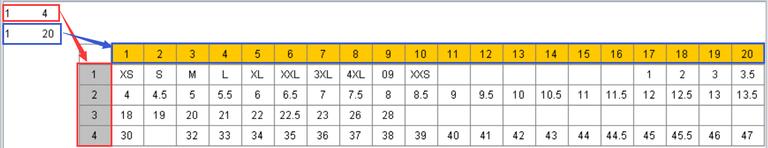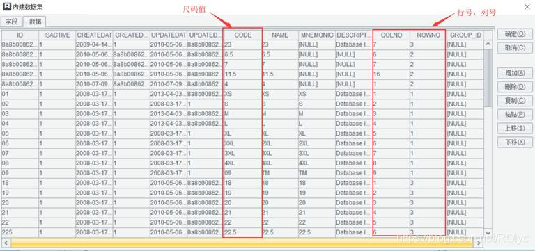 在 COLNO,ROWNO 中分别存储了对应尺码表在报表的坐标数据,CODE 字段存储的是对应的尺码值,我们怎样根据行列坐标从一个字段中读取尺码信息,形成上面那 4 行的尺码对照表呢?
