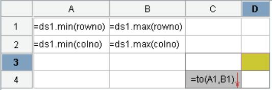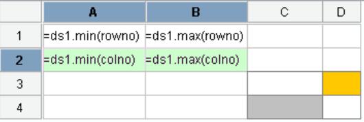 在 A2 中通过 ds1.min(colno) 取出所有尺码中列号的最小值,在 B2 中通过 ds1.max(colno) 得到列号的最大值。