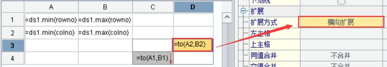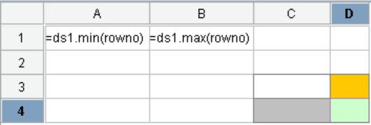 在 A1 中通过 ds1.min(rowno) 取出所有尺码中行号的最小值,在 B1 中通过 ds1.max(rowno) 得到行号的最大值。