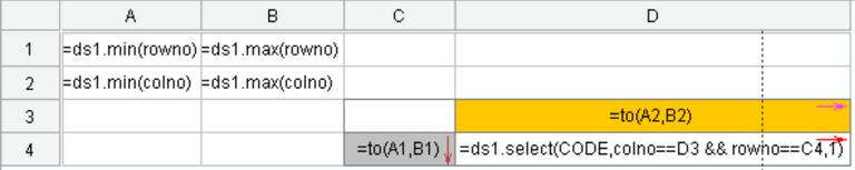 中间的交叉点 D4 单元格则用 ds1.select(CODE,colno==D3 && rowno==C4,1) 将对应行列坐标的数据检索出来。