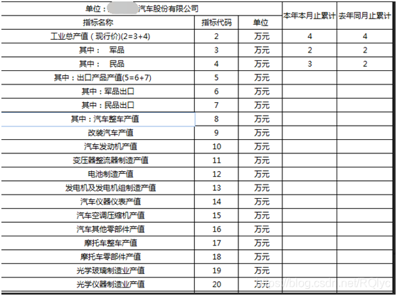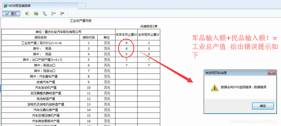 报表数据来源于数据库,其中 A 列指标名称是从数据库扩展取出的,要求各项计算结果满足分组内各值相加等于分组小计(比如:要求本年本月累计项中,指标代码 2 = 指标代码 3 + 指标代码 4),如果不满足则给出提示信息,要求进行修改,满足则可以正常提交。