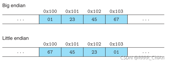对于跨越多个字节的程序对象,必须建立两个约定,即确定对象的地址是什么,以及如何在内存中排列字节。在几乎所有机器中,多字节对象被存储为一个连续的字节序列,对象的地址由所使用的字节的最小地址给出。举个例子,假设有个int类型,大小4byte,地址是0x100,那么这个东西占据的内存是0x100、0x101、0x102、0x103。