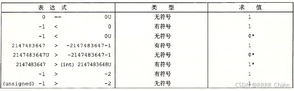 由于C 语言对同时包含有符号和无符号数表达式的这种处理方式,出现了一些奇特的行为。当执行一个运算时,如果它的一个运算数是有符号的而另一个是无符号的,那么C语言会隐式地将有符号参数强制类型转换为无符号数,并假设这两个数都是非负的,来执 行这个运算。就像我们将要看到的,这种方法对于标准的算术运算来说并无多大差异,但 是对于像<和>这样的关系运算符来说,它会导致非直观的结果。下展示了一些关系表达式的示例以及它们得到的求值结果,这里假设数据类型int 表示为32 位补码。考虑比较式-1<0U 。因为第二个运算数是无符号的,第一个运算数就会被隐式地转换为无符号数,因此表达式就等价于4294967295U<0U(), 这个答案显然是错的。其他那些示例也可以通过相似的分析来理解。