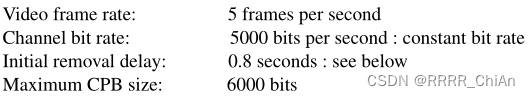 相应的解码器CPB行为如下图所示。初始CPB的删除延迟是必要的,以便在帧解码之前接收到足够的数据,在本例中为0.8秒。在第0帧被解码并立即从缓冲区中移除之前的初始延迟期间,CPB以恒定的信道速率填充。当前五帧解码后,CPB接近底流状态。