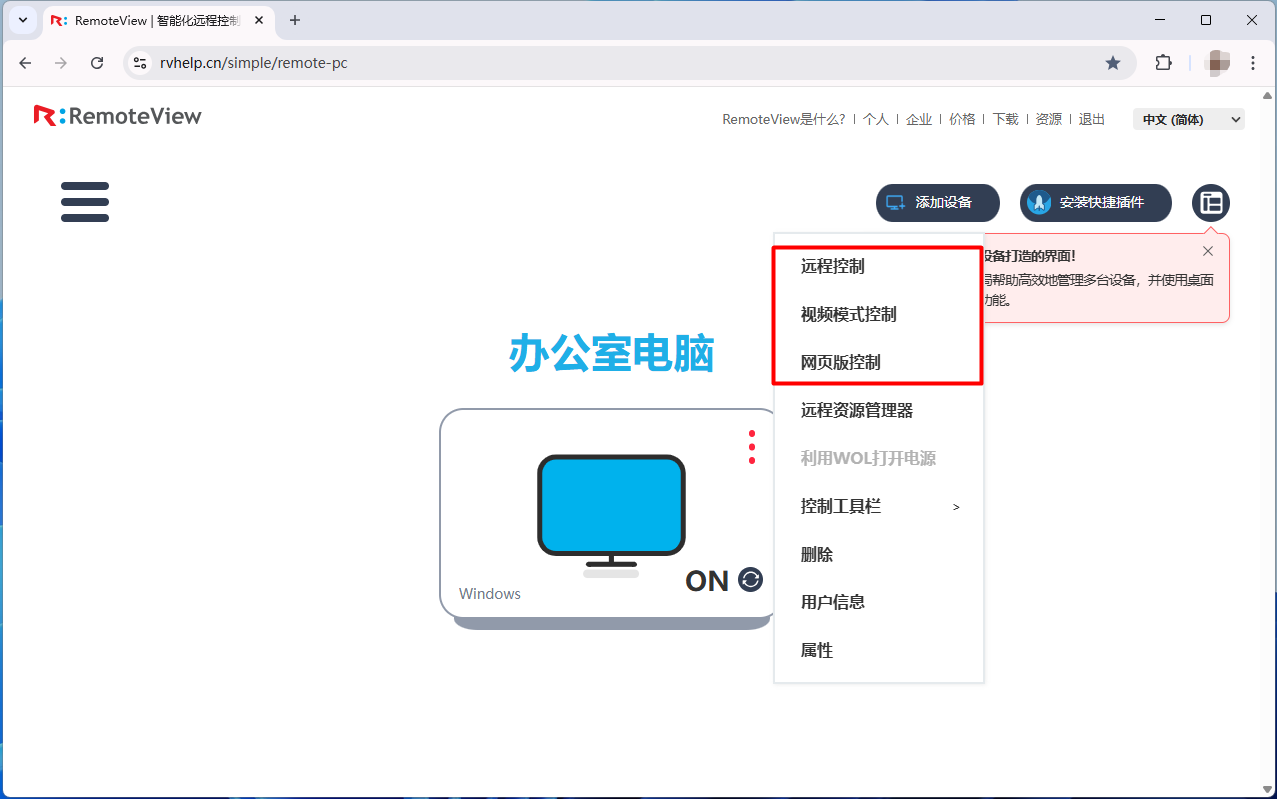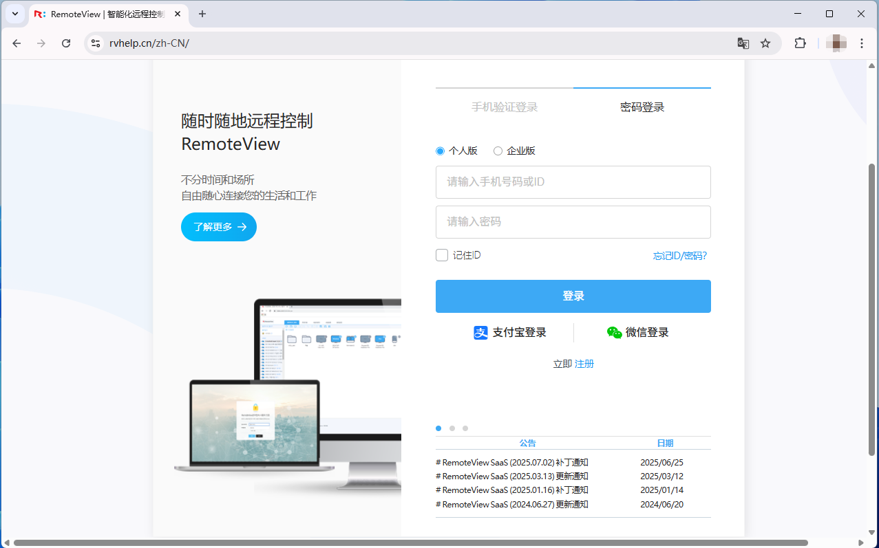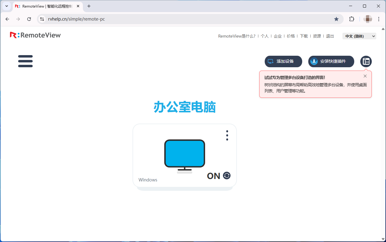 在需要被控制的电脑上打开RemoteView控制台网页并登录。
