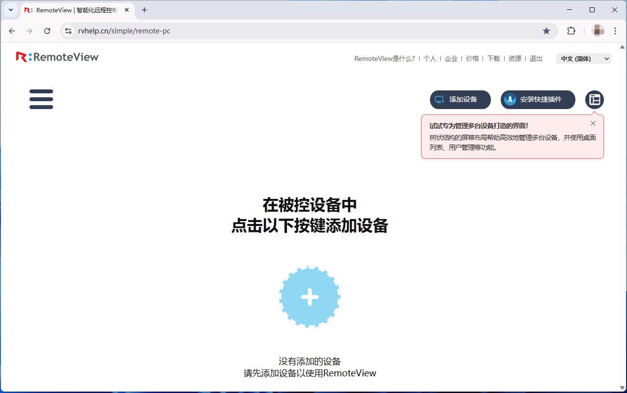 点击添加设备的“+”键下载安装 RemoteView 被控端程序。