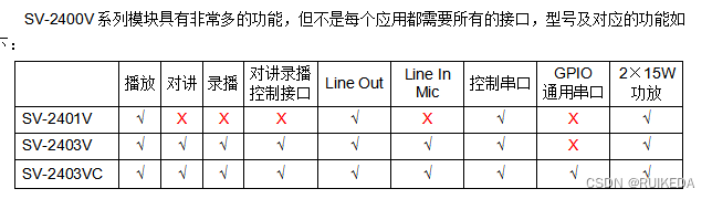 - 双向模式: 双向对讲,带高性能回声抑制算法,8kHz采样,ADPCM编码