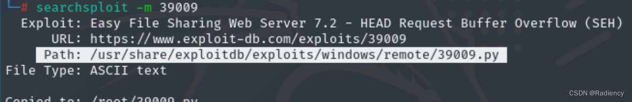 3.得知靶机运行的服务,随后使用命令:searchsploit easy file sharing ,该命令可以搜索到标题和路径中包含“easy file sharing”的所有内容