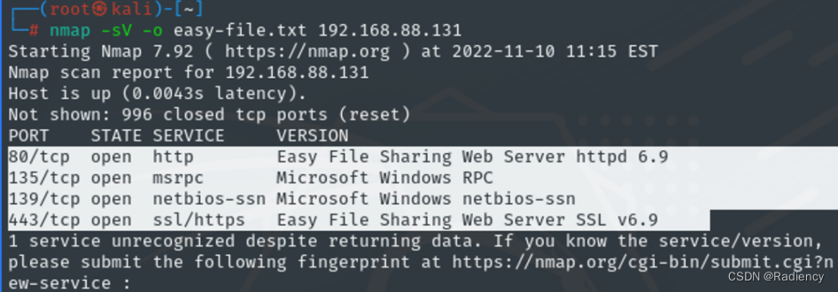 2. 输入命令 nmap -sV -o easy-file.txt 192.168.88.131将扫描靶机上服务的版本记录在easy-file.txt文件里。-sV 探测服务/版本信息 -o 输出