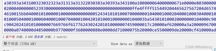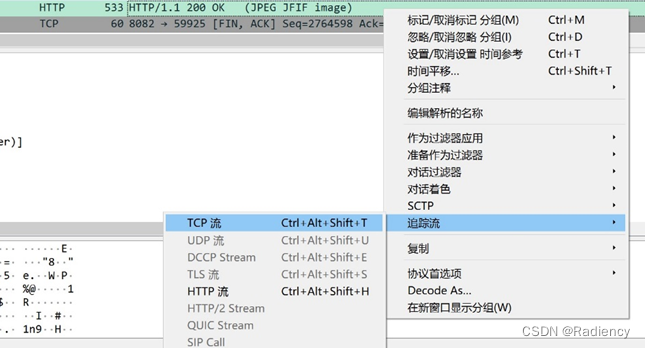 选中,右键选择追踪(follow)TCP流(TCP stream),会得到这个流的全部内容包括数据包。