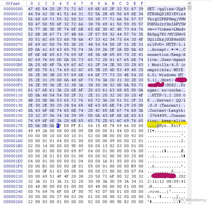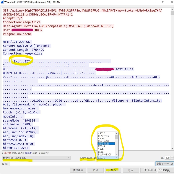 我们保存了这个流全部内容,其中含有与图片数据报文无关的报文,所以图片无法识别打开。由于流中的内容按在网络中出现顺序排序的,我们只需要把非图片报文的部分删除即可。