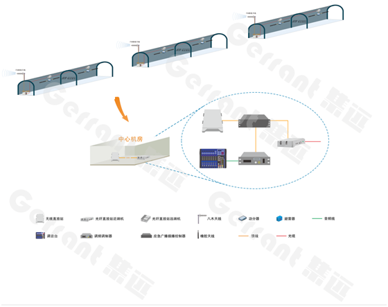 由于高速公路里程长,隧道多,为方便管理,可将调频广播系统网管中心和应急切换中心设置在每段高速的管理中心,实现多条隧道的集中统一管理。