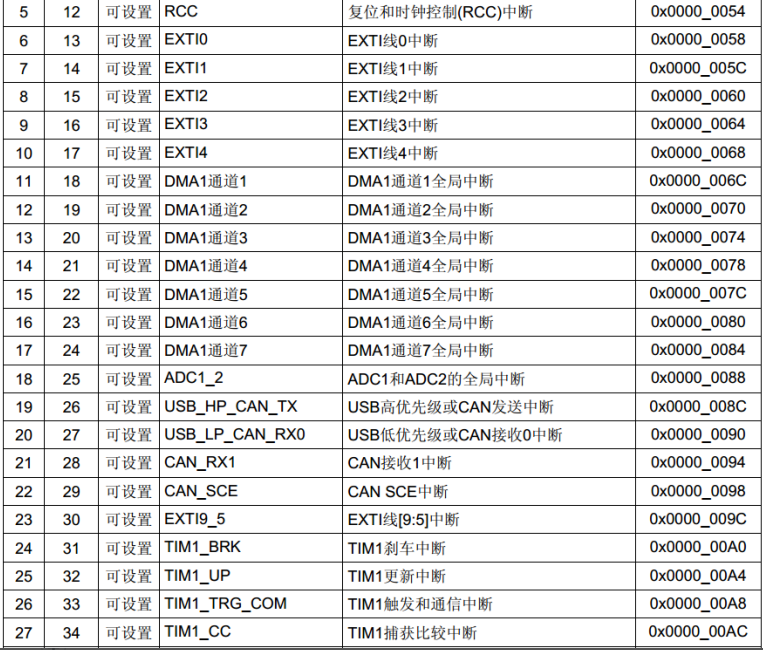68个可屏蔽中断通道(中断源),F1系列最多的中断数量,包含EXTI(外部中断)、TIM(定时器)、ADC(模数转换器)、USART(串口)、SPI通信、I2C通信、RTC实时时钟等多个外设