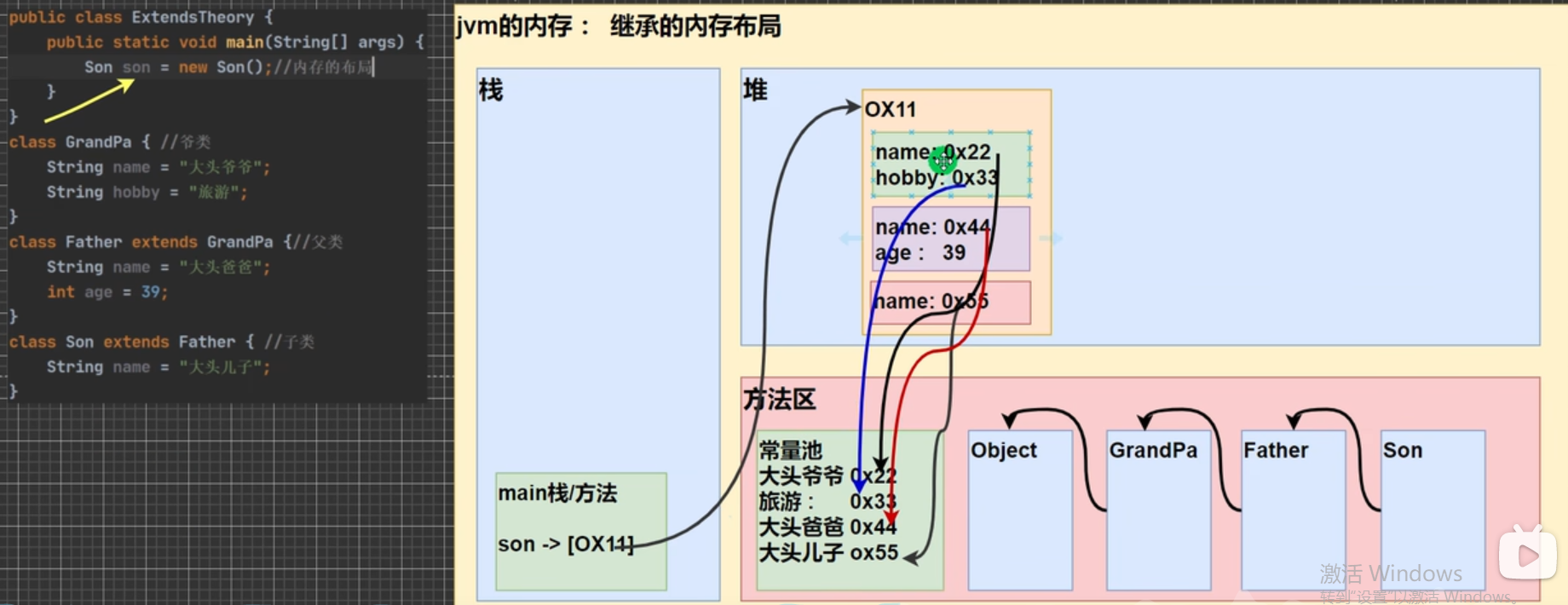 先在方法区加载类之间的关系,然后在堆中分配空间