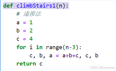 for i in range(n-3)从第4阶开始计算到第n阶的方法数。每次迭代,都会根据前三个数更新方法数:- 当前阶的方法数