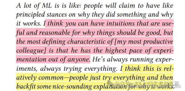 - 保持 GPU 温暖:多位受访者表示,他们会不断进行实验以利用他们的计算资源(“保持 GPU 温暖”)。他们后来意识到,正确的做法是明智地进行实验,并思考什么可以获得最高的投资回报率。一个人声称,他们意识到将他们的认知资源一次花在一个重要的想法上比将其分散在不同的地方更有成效。我有点困惑为什么这并不明显,我不确定作者是否在这里欺骗我们。如果不为了实验而进行实验不是一个明显的原则,请告诉我为什么。