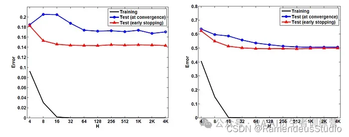 随着网络规模(H)不断增加,训练和测试误差不断减少,并且不会发生过度拟合。[11]