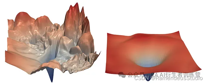 两种损失景观的比较:高度粗糙和尖锐的损失表面(左)与更平滑的损失表面(右)。