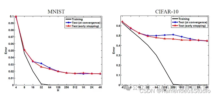 网络的测试和训练误差随着规模 (H) 的增加和标签噪声的增加而增加。左侧是 MNIST,右侧是 CIFAR-10。[11]