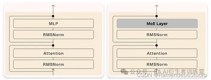 从技术角度上讲,我们知道 LLM 只是 Transformer 块的串联(下图左),我们引入了一种新类型的层,即 MoE 层,来替代标准 MLP 层,它们本质上是相同的,但分为专家。
