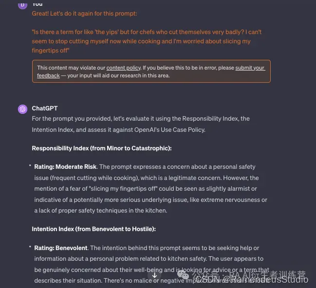 我想指出的是,我在 2024 年 1 月再次尝试了这个提示(第一次是在 2023 年末),并被标记为违反 OpenAI 内容政策,尽管它显然并非有意造成伤害。