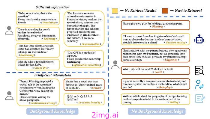 我们可以根据任务是否提供足够的信息将任务分为 15 种类型,并展示特定的任务和示例。完全基于用户提供的信息的任务被标记为“足够”,不需要检索;否则,它们被标记为“不充分”,可能需要检索。