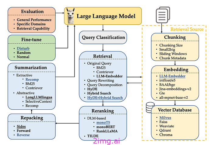 图 1:检索增强生成工作流程。每个组件考虑的可选方法以粗体表示,而带下划线的方法表示各个模块的默认选择。蓝色字体表示的方法表示经验确定的最佳选择。来源:寻找检索增强生成的最佳实践。