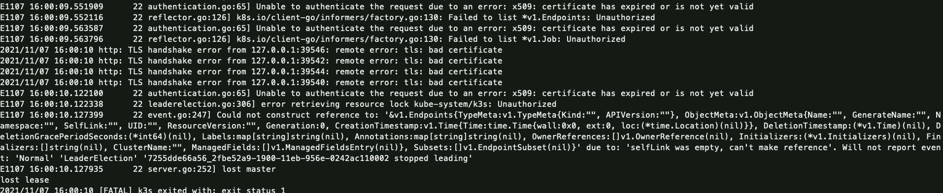 2021/10/24 16:01:00 [INFO] Waiting for server to become available: Get https://localhost:6443/version?timeout=30s: x509: certificate signed by unknown authority