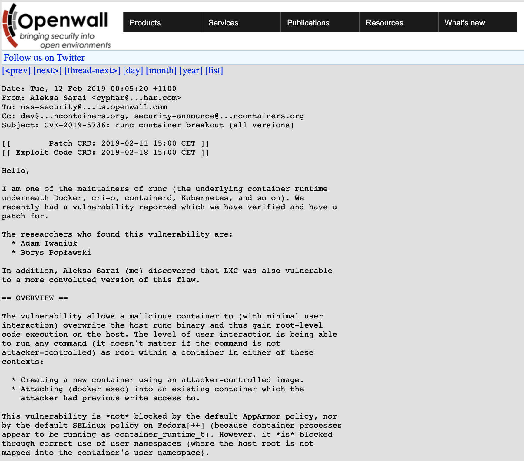 runc是一个根据OCI(Open Container Initiative)标准创建并运行容器的CLI tool,目前Docker引擎内部也是基于runc构建的。2019年2月11日,研究人员通过oss-security邮件列表披露了runc容器逃逸漏洞的详情,根据OpenWall的规定EXP会在7天后也就是2019年2月18日公开。