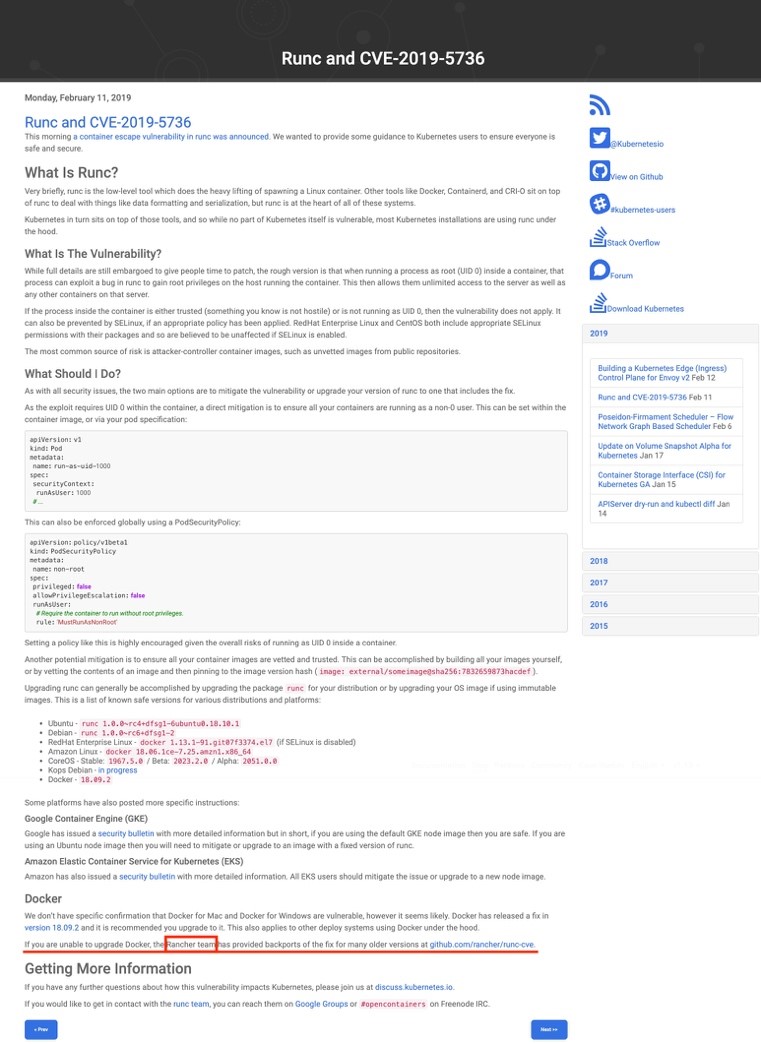 使用K8s的用户都很清楚,K8s并不能兼容太高的Docker版本,所以更新官方Docker版本是很难的一件事,为此K8s官方特意发表了一篇Blog:https://kubernetes.io/blog/2019/02/11/runc-and-cve-2019-5736/ 。 主要思想就是,不要在容器中使用root,它推荐的方案是使用PodSecurityPolicy。当然很多用户修改PodSecurityPolicy后可能会引发各种问题,所以它也推荐用户更新Docker。 同时它也提到,不能更新Docker的用户,可以使用Rancher提供的方案,Rancher为每个版本都移植了补丁: