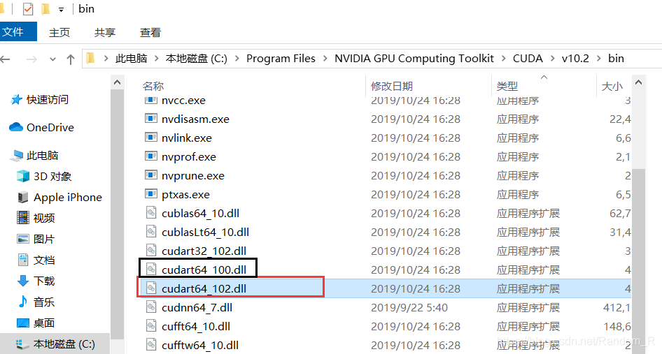 解决方案:进入 "cuda安装路径/v10.2/bin" 将 "cudart64_102.dll"复制一份儿到这里,并重命名为 "cudart64_100.dll",如图
