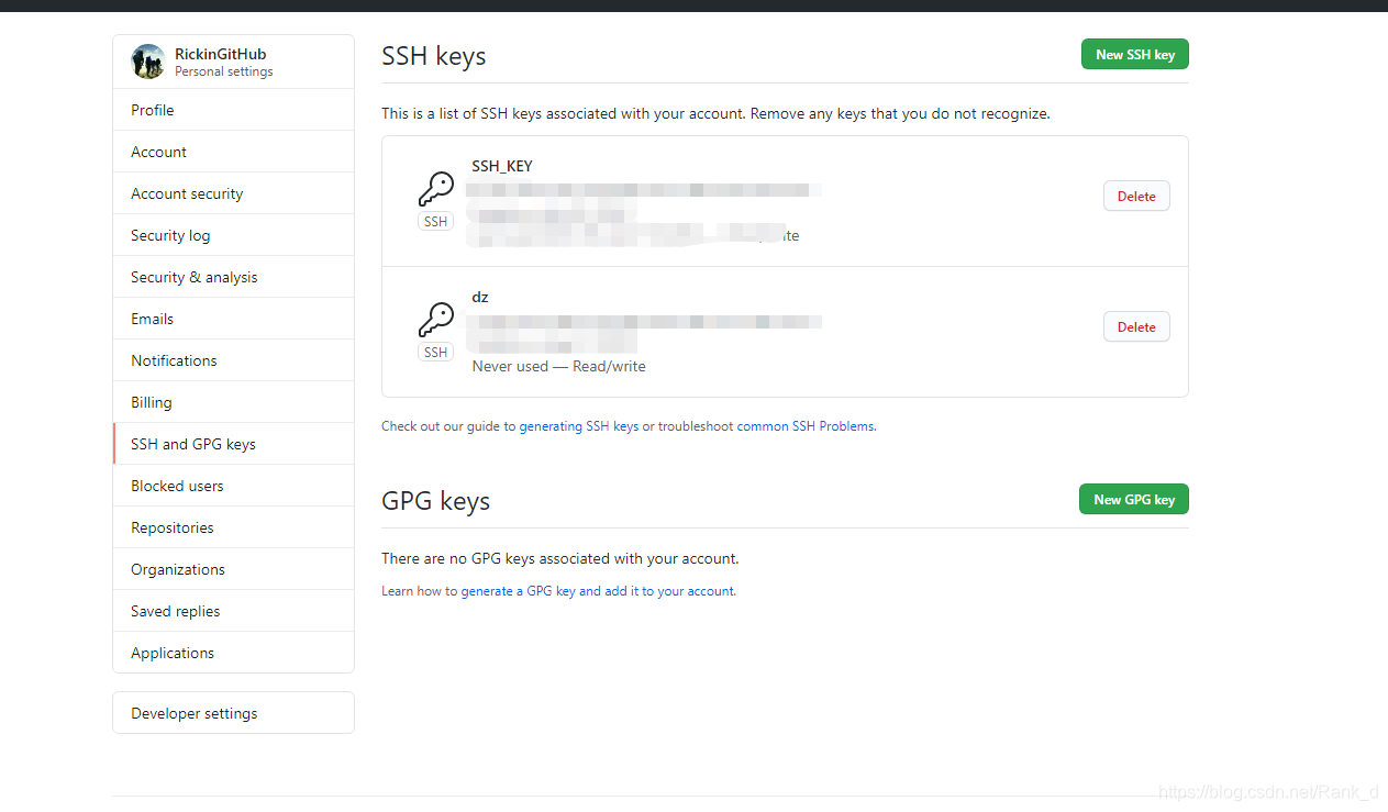 2. 将生成的公钥加到github. 在github setting界面,选择SSH and GPG keys添加