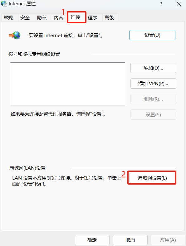 4. (1)点击连接;(2)点击局域网设置